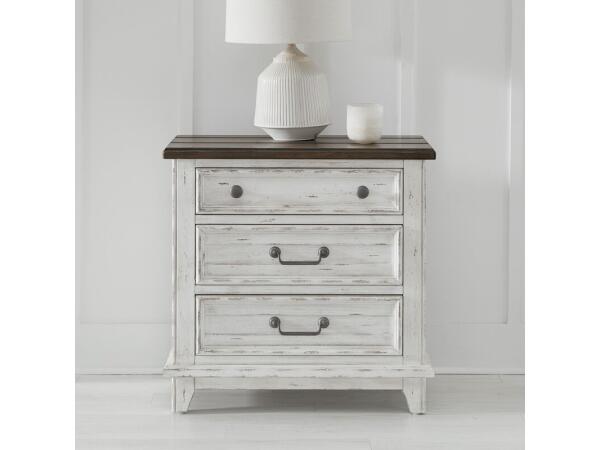 This River Place nightstand features three drawers, a distressed Riverstone White and Tobacco finish, and farmhouse styling. It offers soft-closing drawers with felt and cedar lining, plus a built-in charging station with AC, USB, and USB-C ports.