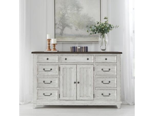 This River Place 2-door, 9-drawer dresser features Pine solids and veneers with a distressed Riverstone White and Tobacco finish in farmhouse style. It includes soft-closing drawers with felt and cedar lining, an adjustable shelf behind the doors, and Ant