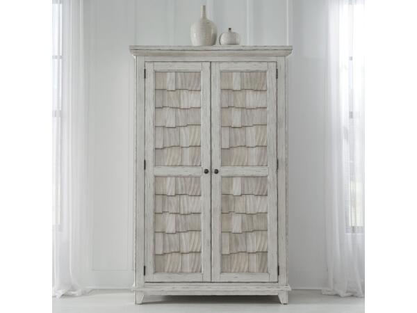 This River Place armoire, crafted from Pine solids and veneers, features a distressed Riverstone White and Tobacco finish with farmhouse styling. It offers two shingle-accented doors with three adjustable shelves, two concealed soft-closing drawers, and A