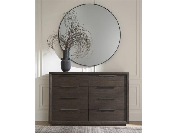 Leather upholstered platform bed with a plush headboard and low‑profile frame on block legs. Customizable leather options create a refined, modern focal point.