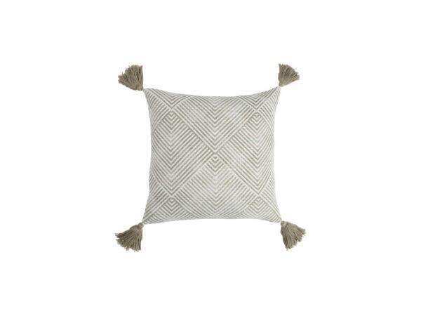 Textured cotton pillow cover with hand printing and corner tassels, offering a soft feel and durable woven look. Insert not included.