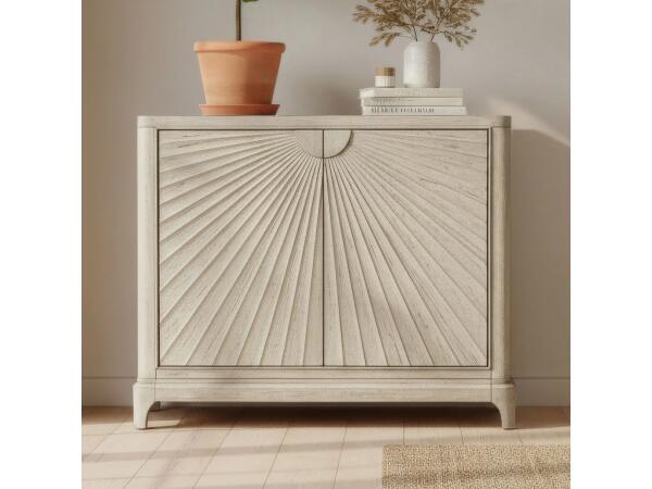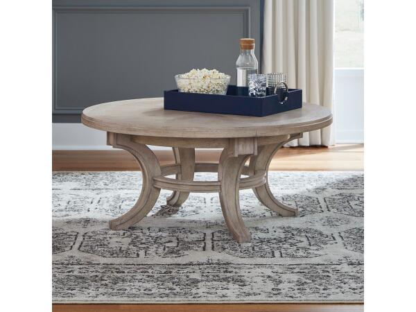 This elegant round cocktail table serves as a striking centerpiece with its starburst fancy face veneer top. The design is supported by graceful saber legs and is enhanced with a decorative interlocking ring accent.