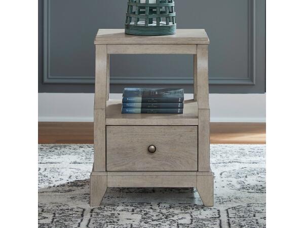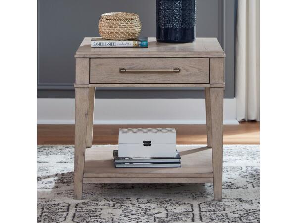 This classic end table offers both storage and style with a flat-front drawer and an open bottom shelf. Built with French & English dovetail construction, it features square tapered legs and champagne silver hardware.