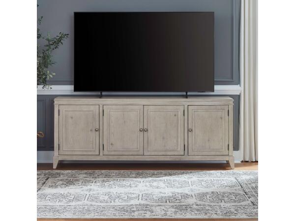 This 82-inch TV console offers ample media storage with four flat-front doors, each concealing an adjustable wood shelf. It is finished with champagne silver hardware and angled tapered feet for a clean, modern look.