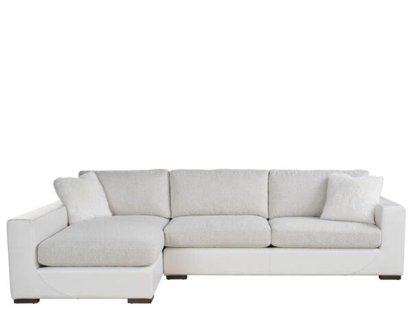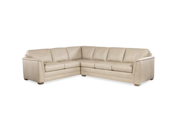 Transitional leather sectional with eight-way hand-tied seating and Spring Down cushions for durable support. Loose back cushions with Velcro and customizable wood finishes.