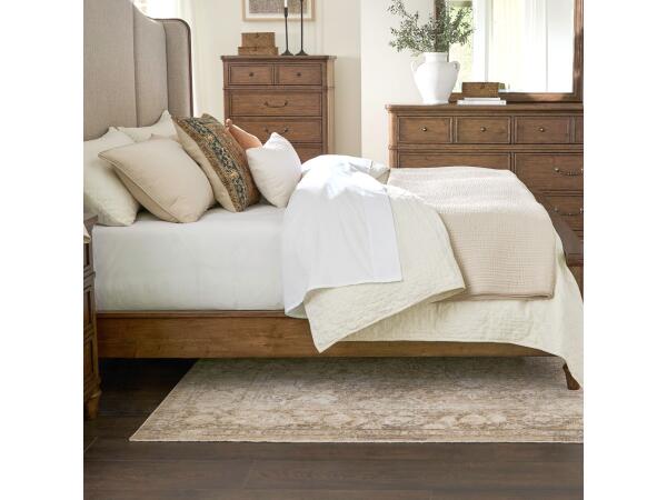 This Queen shelter bed set, including a dresser, mirror, and nightstand, offers frosted beige upholstery and antique brass hardware. The nightstand features a built-in charging station with AC, USB-A, and USB-C ports, complemented by felt-lined top and ce