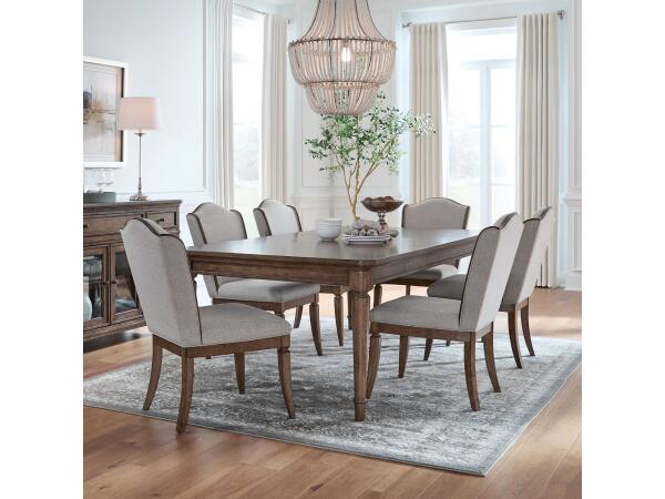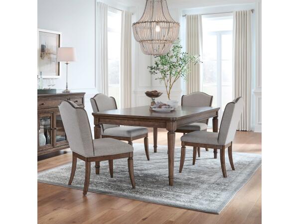 This 7-piece rectangular dining set includes a table with a self-storing 18-inch leaf and six side chairs with Frosted Beige upholstery. The table features a 4-way match fancy face veneer top and turned legs.