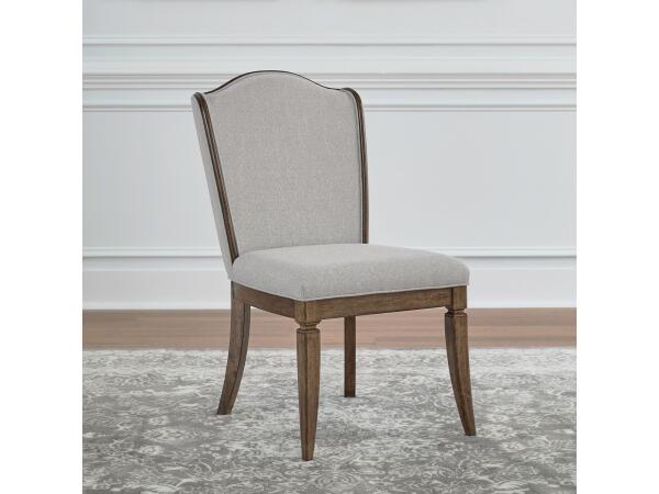 This upholstered side chair features frosted beige fabric and elegant wood frame accents with saber legs. Nylon chair glides are included to protect your flooring.