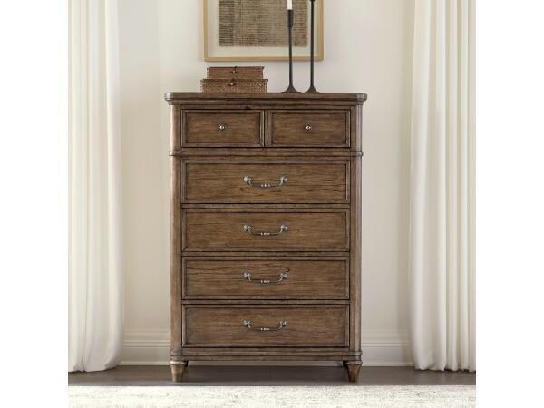 A five-drawer chest featuring a felt-lined top drawer and a cedar-lined bottom drawer for protected storage. This storage chest is accented with antique brass hardware, softly rounded pilasters, and turned feet.