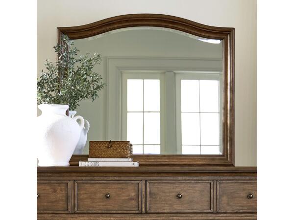 This landscape mirror features a softly arched cap rail and a 1-inch beveled edge for a touch of elegance. It includes bolt-on supports for easy attachment to a dresser.