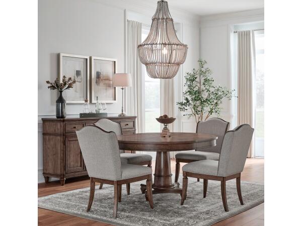 This 5-piece dining set includes a pedestal table with a removable 12-inch leaf and four side chairs featuring Frosted Beige upholstery. The table uses an easy-glide track system for convenient extension.