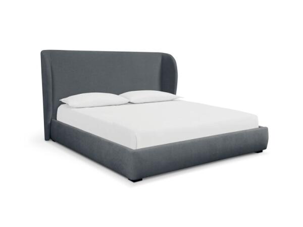 Modern upholstered platform bed with a winged headboard and softly rounded rails, built to the floor for a clean, contemporary look. Customizable in fabric or leather; no foundation required.