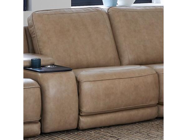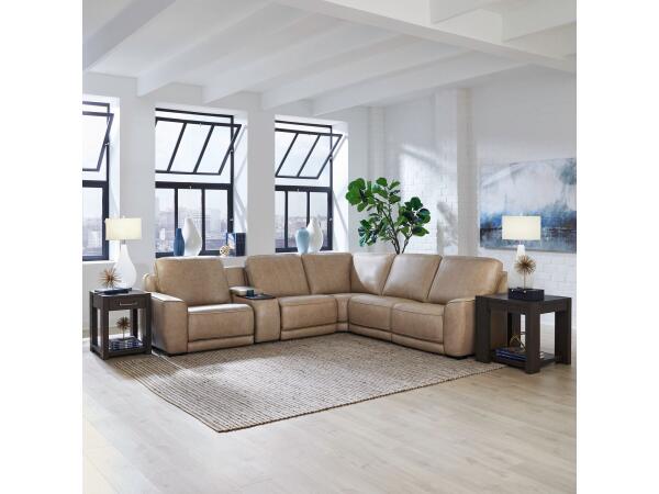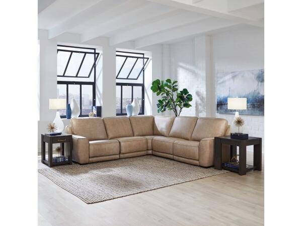 This five-piece sectional includes a dual power zero wall recline feature and a synchronized power headrest for enhanced comfort. It combines a stationary look with motion functionality, finished with decorative welting.