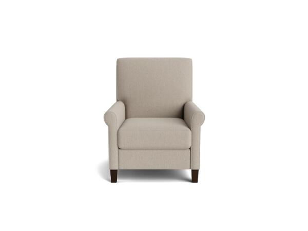 Lay-flat manual recliner with classic sock arms, a smooth seatback, and tapered block legs. Customize fabric, cushion comfort, and leg finish; power and USB options available.