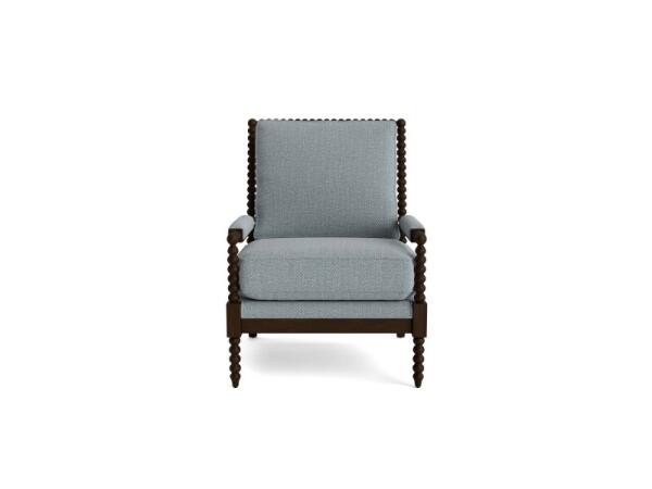 Spool-style accent chair with a carved wood frame and customizable upholstery. Webbed seat construction provides even support, with a removable back cushion.