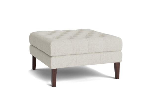 25 in. square fabric ottoman with a smooth, top-stitched cushion and supportive webbed seating. Tall, tapered walnut-finished legs complete the clean look.