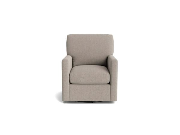 Fabric swivel glider chair with attached back and seat cushions for consistent comfort. Topstitched box borders and slim track arms give it a clean, timeless look.