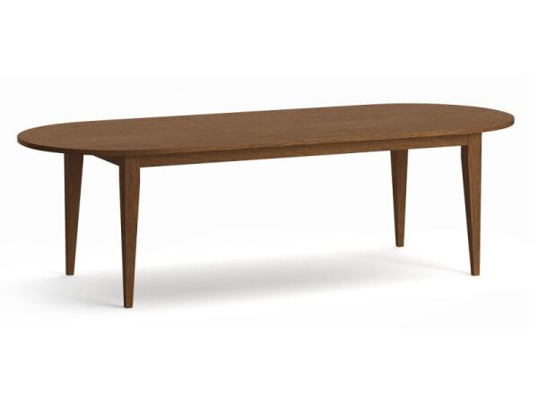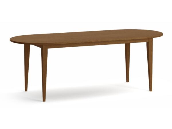 Counter-height oval dining table in solid white oak with a 1 in. thick top and contemporary tapered legs. Seats 4–6; available in lightly distressed finishes and 84 or 102 in. lengths.