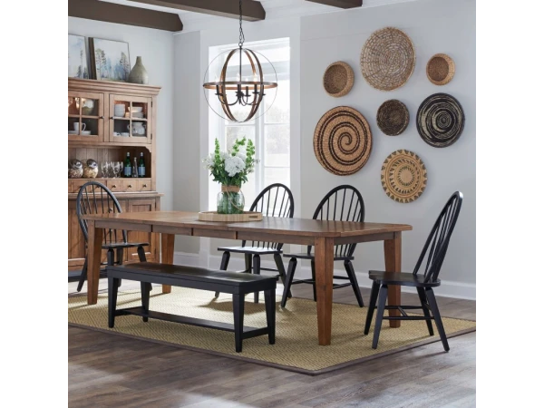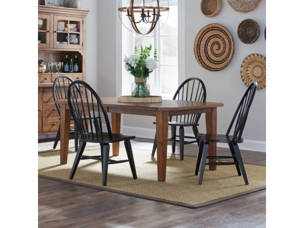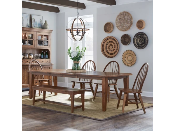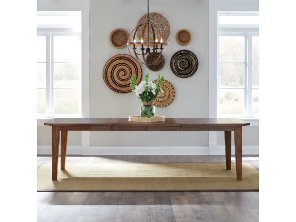 This Hearthstone Ridge rectangular leg table is crafted from rubberwood solids and oak veneers with a rustic oak finish. It includes two 18-inch removable leaves and features a planked top with tapered legs.