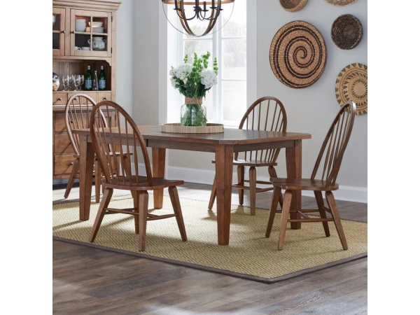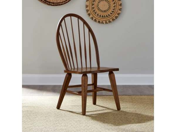 This Hearthstone Ridge Windsor back side chair, crafted from rubberwood solids with a rustic oak finish, features a shaped seat for comfort and splayed tapered legs. It includes nylon chair glides and has a 300 lbs. weight limit.