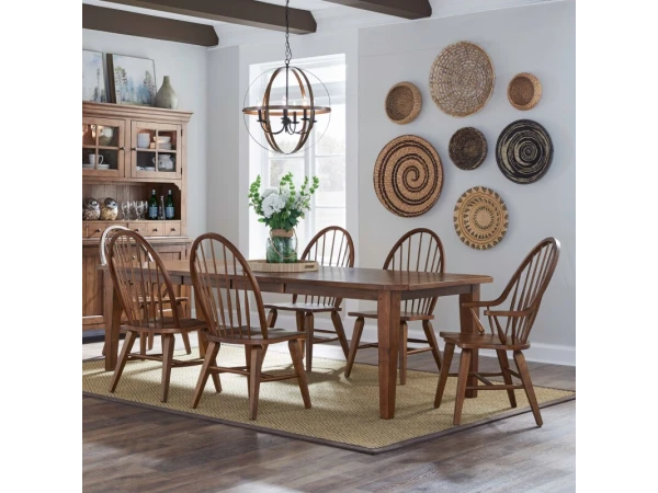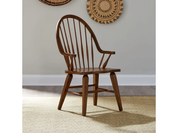 This Hearthstone Ridge Windsor back arm chair, crafted from rubberwood solids with a rustic oak finish, features a shaped seat for comfort and splayed tapered legs. It includes nylon chair glides and has a 300 lbs. weight limit.