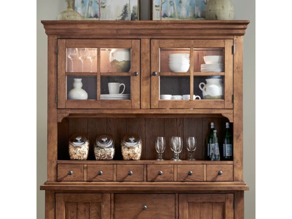 This Hearthstone Ridge hutch, crafted from rubberwood solids and oak veneers with a Tobacco & Black finish, features heavy crown molding, seeded glass doors, and interior lighting. It includes apothecary-style drawers and wood peg accents.