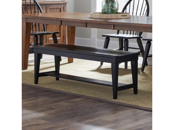 This Hearthstone Ridge bench is crafted from rubberwood solids with a black finish, featuring a comfortable saddle-shaped seat. It includes nylon glides to protect flooring and wooden peg accents.