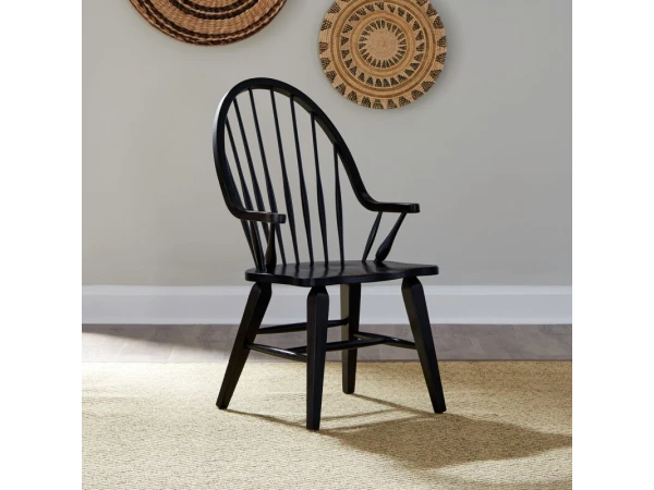 This Hearthstone Ridge Windsor back arm chair, crafted from rubberwood solids with a black finish, features a shaped seat for comfort and splayed tapered legs. It includes nylon chair glides and has a 300 lbs. weight limit.