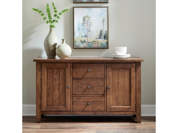 This Hearthstone Ridge buffet is crafted from rubberwood solids and oak veneers with a rustic oak finish, accented by antique brass hardware. It offers three felt-lined full extension drawers and two planked doors with adjustable shelves.
