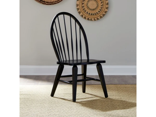 This Hearthstone Ridge Windsor back side chair is crafted from rubberwood solids with a black finish. It features a shaped seat for comfort, splayed tapered legs, and nylon glides to protect your floor.