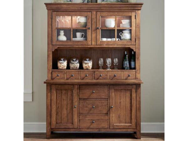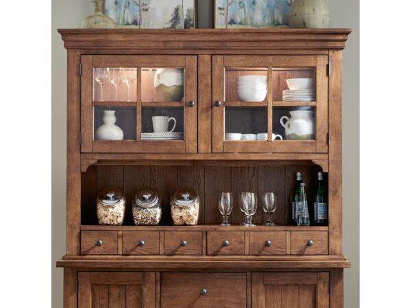This Hearthstone Ridge hutch, crafted from rubberwood solids and oak veneers with a Tobacco & Black finish, features heavy crown molding, seeded glass doors, and interior lighting. It includes apothecary-style drawers and wood peg accents.