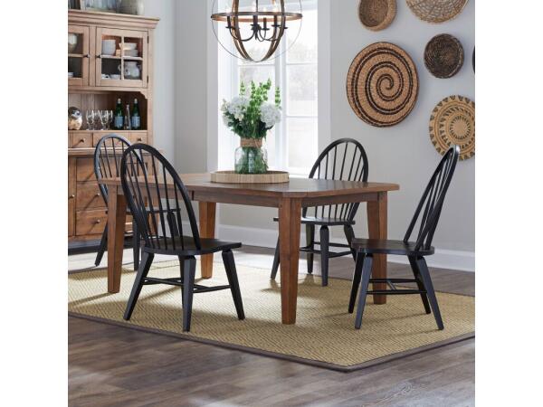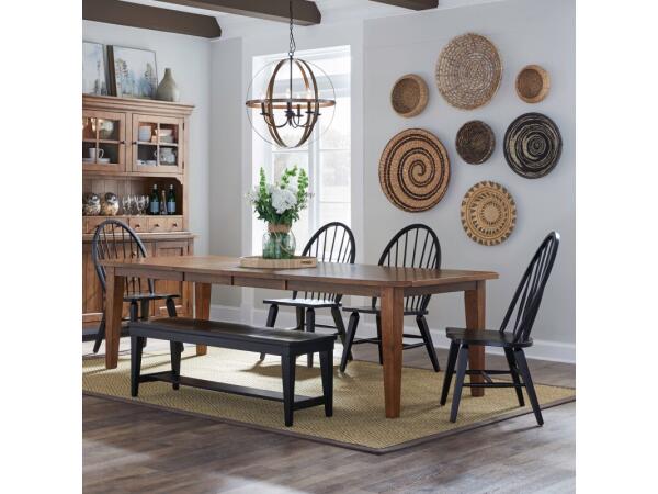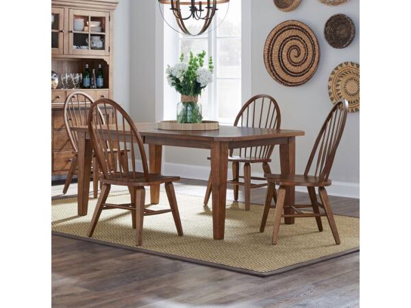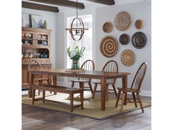 This Hearthstone Ridge rectangular leg table is crafted from rubberwood solids and oak veneers with a rustic oak finish. It includes two 18-inch removable leaves and features a planked top with tapered legs.