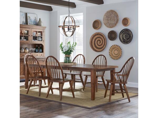 This Hearthstone Ridge Windsor back arm chair, crafted from rubberwood solids with a rustic oak finish, features a shaped seat for comfort and splayed tapered legs. It includes nylon chair glides and has a 300 lbs. weight limit.