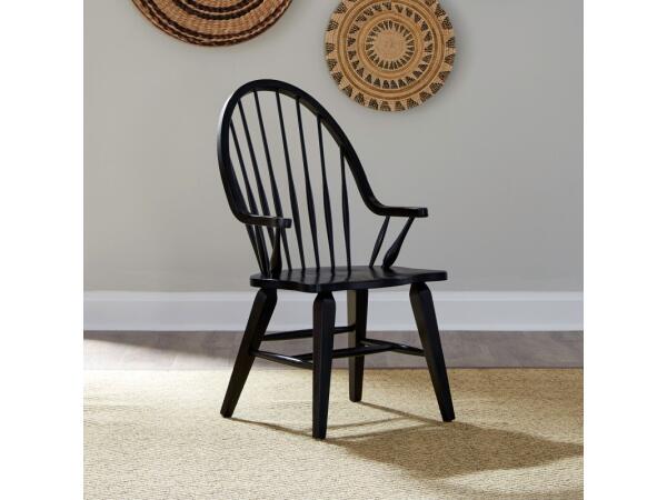 This Hearthstone Ridge Windsor back arm chair, crafted from rubberwood solids with a black finish, features a shaped seat for comfort and splayed tapered legs. It includes nylon chair glides and has a 300 lbs. weight limit.