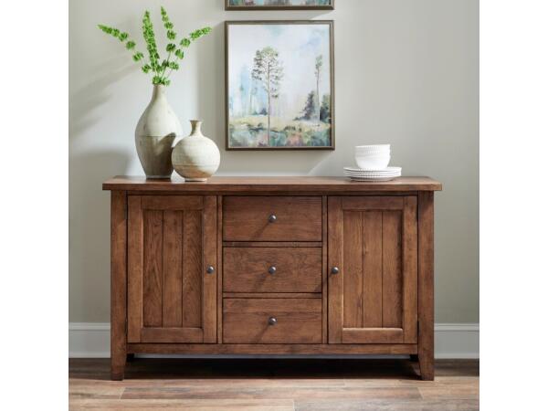 This Hearthstone Ridge buffet is crafted from rubberwood solids and oak veneers with a rustic oak finish, accented by antique brass hardware. It offers three felt-lined full extension drawers and two planked doors with adjustable shelves.
