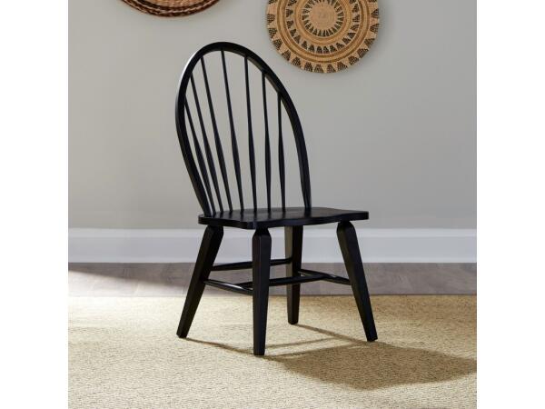 This Hearthstone Ridge Windsor back side chair is crafted from rubberwood solids with a black finish. It features a shaped seat for comfort, splayed tapered legs, and nylon glides to protect your floor.