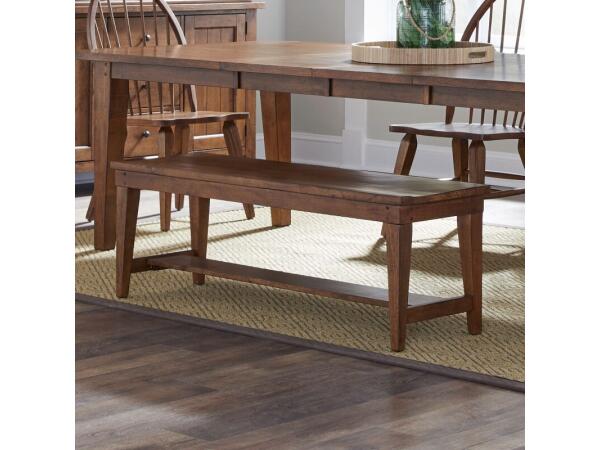 This Hearthstone Ridge bench is crafted from rubberwood solids with a rustic oak finish, featuring a comfortable saddle-shaped seat. It includes nylon glides to protect flooring and wooden peg accents.