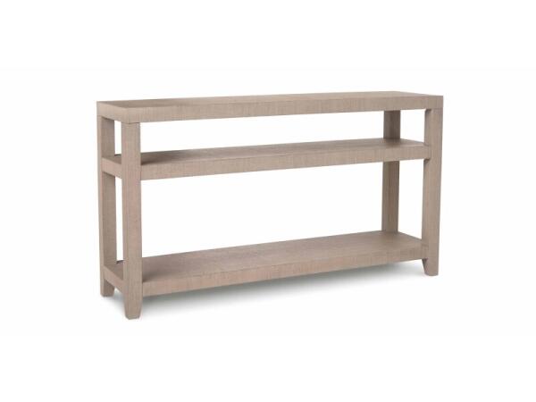 Raffia‑wrapped console table with lightly textured finish and two sturdy lower shelves for display. 54 in. W x 14 in. D x 30 in. H.