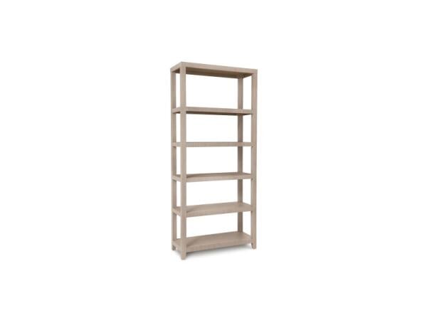Open etagere wrapped in lightly textured raffia with five wide shelves for airy storage and display. Raffia and wood construction; 40 in. W x 16 in. D x 90 in. H.