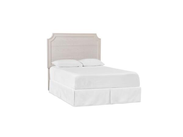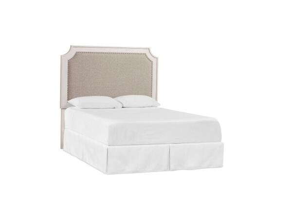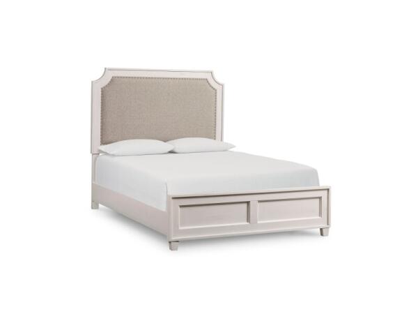 Upholstered bed styled with nailhead trim, offered in Chalk Slate or Shell White finishes. Wood and fabric construction provides a crisp, versatile look.