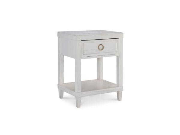 Two-drawer wood nightstand with self-closing guides and a display shelf, available in Chalk Slate or Shell White. Built-in power strip with 2 USB ports and 1 AC outlet plus wire management keeps devices tidy.