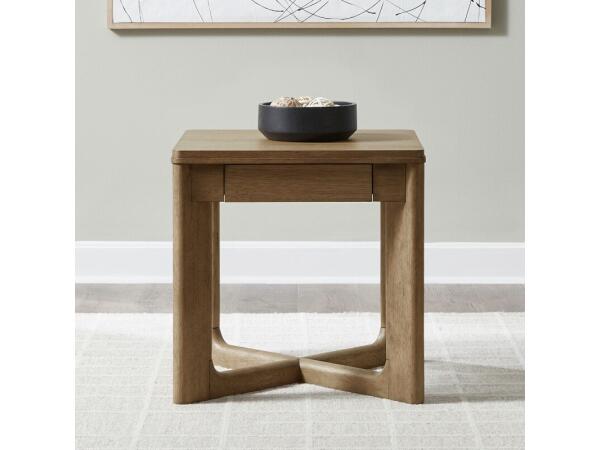 This end table features an X-style trestle base and a hidden interior storage drawer for discreet storage. The drawer is durably constructed with French and English dovetail joinery.