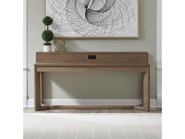 This console bar table is designed with an X-style trestle base for stability and style. It includes a built-in charging station with two AC outlets, one USB-A port, and one USB-C port for modern convenience.