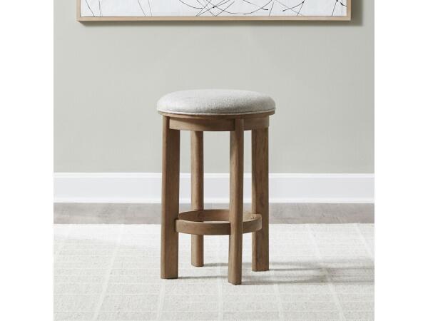 This upholstered console stool features a padded seat in Gray Mist fabric with a memory return swivel function. It is supported by square tapered legs and includes a footrest for added comfort.