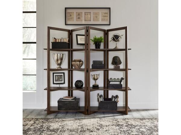 This 72" Lennox open bookcase, crafted from rubberwood solids with white oak veneers, features a weathered chestnut finish and heavy wire brush distressing. It offers four planked shelves for ample storage and a fixed folding style.