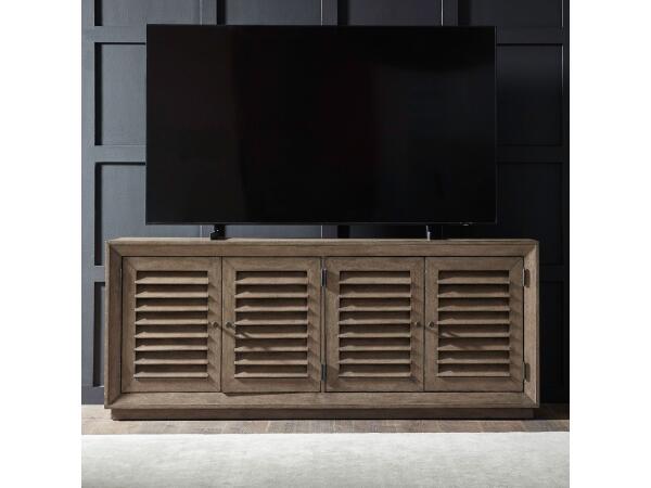 This 78-inch TV console is designed with canted picture frame molding and four louvered panel doors. It offers ample storage with an adjustable wood shelf behind each set of doors and is accented with antique brass knob hardware.
