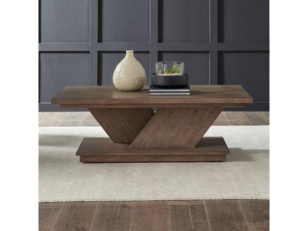 This contemporary cocktail table features a distinctive criss-cross body design with a plinth-style base. It includes casters for easy mobility and an open bottom shelf for extra storage or display space.