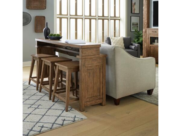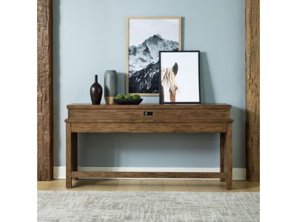 The Pinebrook Ridge console bar table is crafted from pine solids and veneers with a Weathered Toffee finish and planked panels. It features a convenient built-in charging station with two electrical outlets, one USB-A, and one USB-C port for modern conne