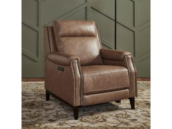 The Carrington swivel glide recliner offers customized comfort with triple power recline, an articulating headrest, and powered lumbar support. Upholstered in York Sand top-grain leather, it includes both USB-A and USB-C charging ports.