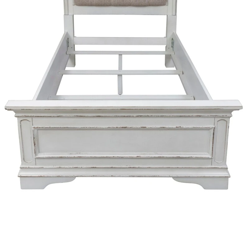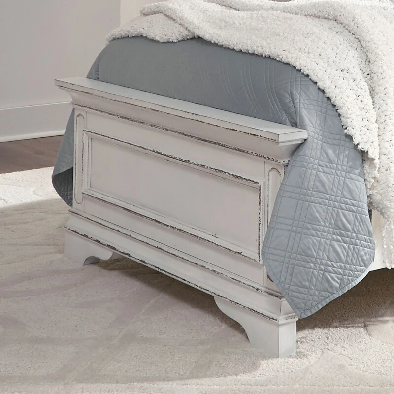 Accent your bedroom with the perfect blend of European Traditional design and casual appeal using the Magnolia Manor Twin Panel Footboard. Finished in a weathered brown and antique white finish with heavy chipping combination this piece is crafted of poplar solids and white oak and birch veneers.The twin panel footboard features a wide cap rail and bead molding accents along with bracket feet that definition and character.